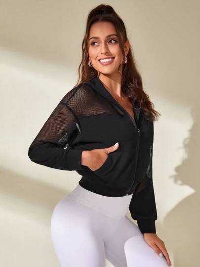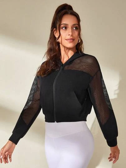 Contrast Fishnet Hooded Crop Sports Jacket