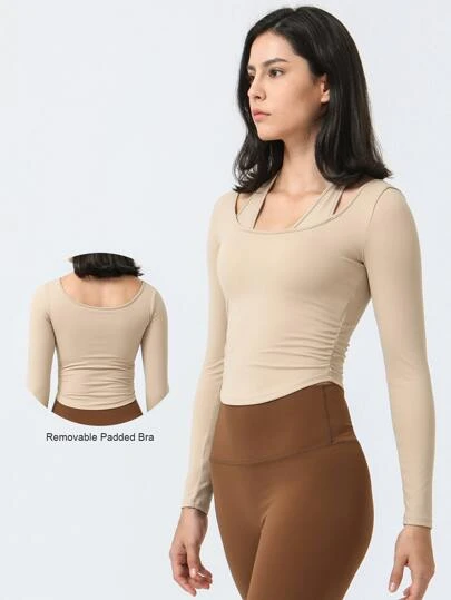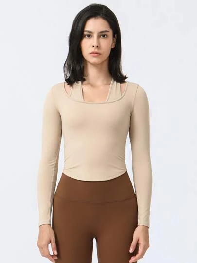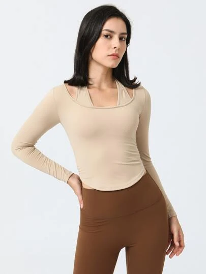 Fake Two Pieces Hanging Neck Running Sports Yoga Suit Long Sleeve T-shirt