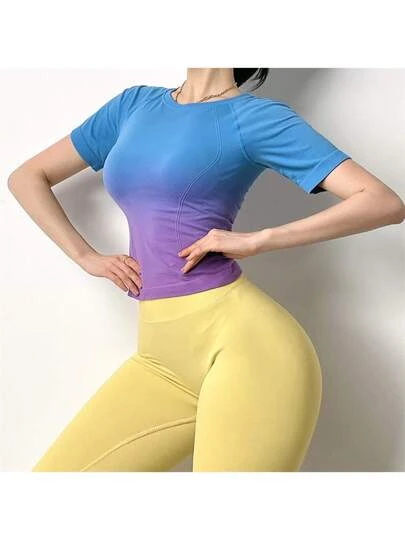 Gradient Colored Fitness Short Sleeve Round Neck Slim Stretchy Sportswear For Women, Suitable For Running/training/yoga