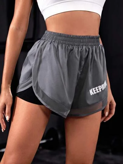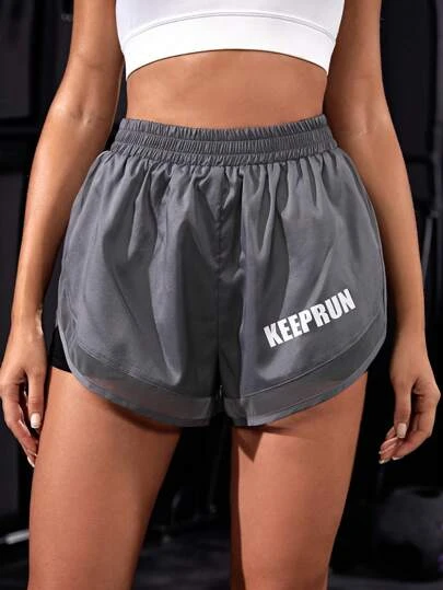Letter Graphic Mesh Insert Sports Shorts With Phone Pocket