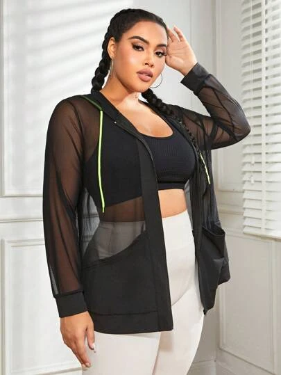 Plus Drawstring Hooded Sheer Mesh Sports Jacket