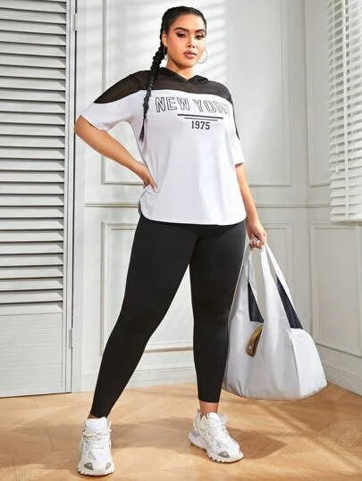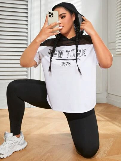 Plus Letter Graphic Contrast Mesh Hooded Sports Tee