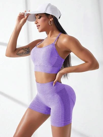 Seamless Solid Bra With Biker Shorts Sports Set