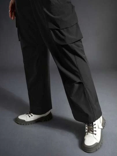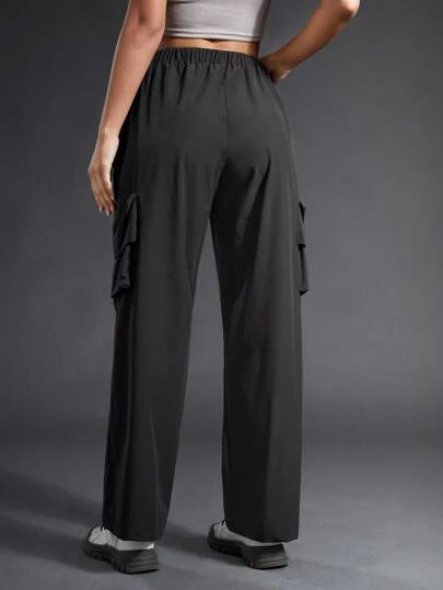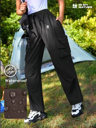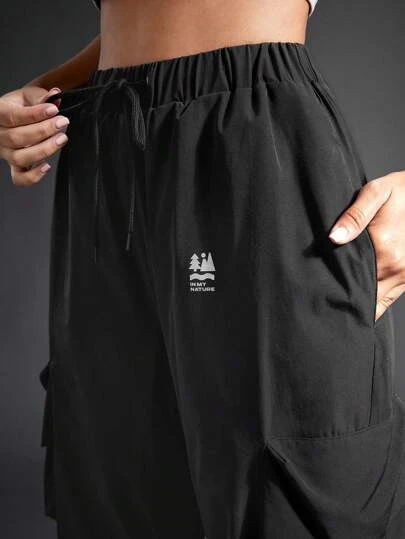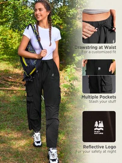 SHEIN In My Nature Women’s Outdoor Waterproof Splash-proof Reflective Logo Print Multi-pocket Elastic Waist Fashion Hiking Pants With Adjustable Waist