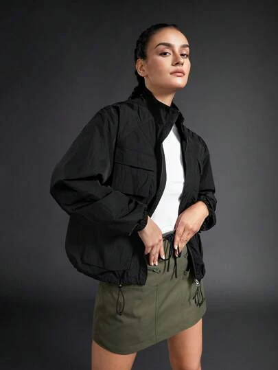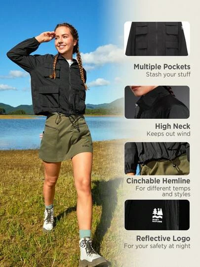 SHEIN In My Nature Women’s Softshell Jacket With Multiple Pockets, Waterproof And Fashionable Loose Fit, Stand Collar, Adjustable Hem