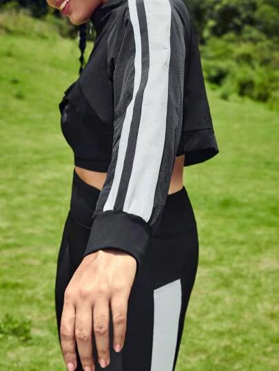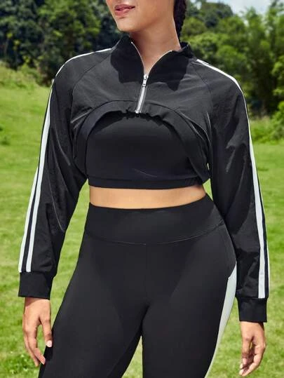 SHEIN Leisure Plus Striped Side Raglan Sleeve Zip Up Crop Sports Jacket