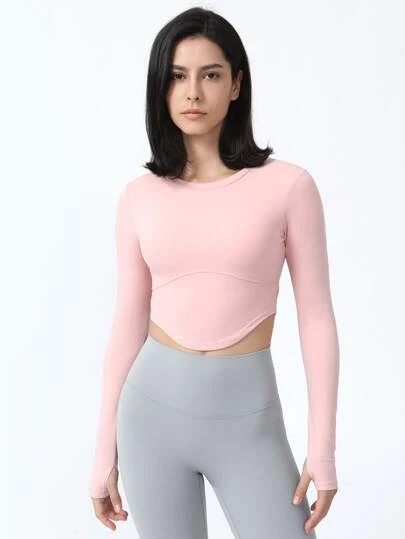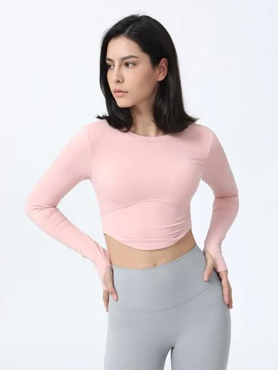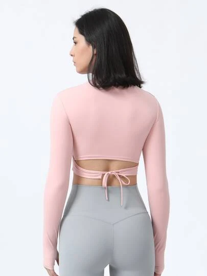 Thumb Hole Back Tie Waist Slim Fit Crop Yoga Top With Long Sleeves