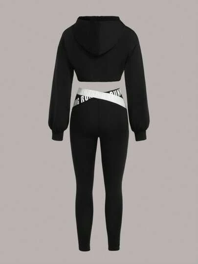 Two Tone Contrast Letter Tape Drop Shoulder Hoodie & Leggings
